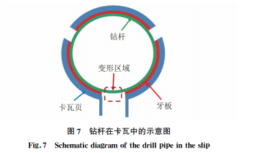 鉆桿發(fā)生擠扁失效的原因為鉆桿在鉆臺坐卡過 程中,管體與卡瓦之間的嚙合接觸不均勻,局部的接 觸應力超過了鉆桿管體的屈服強度而使鉆桿管體發(fā) 生塑性變形,卡瓦牙板磨損較為嚴重是導致卡瓦對 鉆桿的應力分布不均勻的主要原因。