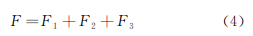 在式(3)中,徑向作用力F 為3個卡瓦牙板對 鉆桿的徑向作用力之和,左側(cè)牙板、右側(cè)牙板和中間 牙板的對鉆桿的徑向作用力分別為F1、F2、F3,那 么則有: