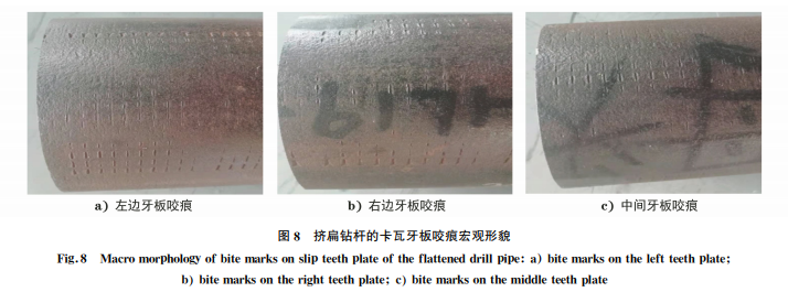 卡瓦牙板對鉆桿夾緊的示意圖如圖7所示,擠 扁失效的區(qū)域在左右兩側(cè)牙板的中間,如圖中所示。 對失效鉆桿的牙板咬痕進行觀察,可觀察到3頁卡 瓦頁對應的牙板咬痕并不均勻,且每一頁卡瓦上的 3列牙板的咬痕也不均勻,甚至沿管體軸向方向,每 一列牙板的不同牙板的咬痕也不均勻,如圖8所示。 圖8a)和b)所示的為變形位置左、右側(cè)牙板咬痕, 3列牙痕中兩側(cè)的牙痕較深,中間列較淺,且每一個 牙板沿圓周方向的每個牙齒的咬痕也是由深到淺。 圖8c)所示為變形位置對面的卡瓦頁所留下的咬 痕,可以看出,這頁牙板的3列牙痕是中間列深,兩 側(cè)列淺。