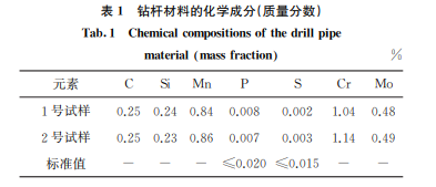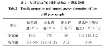 分別從1號和2號鉆桿試樣上取樣,采用 ARL 4460OES型直讀光譜儀對其進行化學成分分析, 結(jié)果見表1??梢娿@桿管體材料的化學成分符合 APISpec5DP-2009標準的要求。