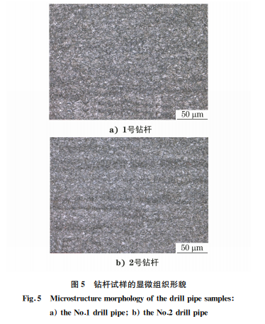 分別從1號鉆桿試樣變形處和2號鉆桿試樣管 體上取金相試樣,依照 GB/T13298-2015《金屬顯 微組織檢驗法》對其進行金相檢驗,金相試樣用4% (體積分數(shù))的硝酸酒精溶液浸蝕,然后在 GX51型 倒置金相顯微鏡下觀察橫截面顯微組織形貌,如圖 5所示。1號鉆桿變形處的顯微組織與2號鉆桿管 體材料的顯微組織相同,均為回火索氏體,晶粒度為 10級。