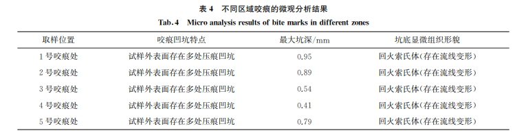 在圖3和圖4所示的1號鉆桿試樣沿整個圓周標注的1、2、3、4、5號咬痕位置取樣,進行金相檢驗 和咬痕深度分析,金相試樣用4%(體積分數(shù))的硝 酸酒精溶液浸蝕,然后在 GX51型倒置金相顯微鏡 下觀察橫截面顯微組織形貌,分析結(jié)果見表4???見咬痕處的組織均發(fā)生了變形,但組織無異常,均為 回火索氏體。