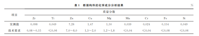 在斷裂構(gòu)件上取樣,采用美國利曼 ProdigyXP ICP型光譜分析儀對其進(jìn)行化學(xué)成分分析,結(jié)果如 表1 所 示,由 表 1 可 知:其 化 學(xué) 成 分 符 合 技 術(shù) 要求。
