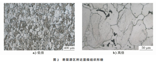 在該構(gòu)件的斷裂源區(qū)和擴(kuò)展區(qū)分別截取試樣并進(jìn) 行金相檢驗,結(jié)果顯示:斷裂源區(qū)附近的組織為α(Al) +彌散相+化合物相,晶界有析出,依據(jù) GB/T6394— 2002《金屬平均晶粒度測定法》對斷裂源區(qū)附近的晶粒 度級別進(jìn)行評定,結(jié)果為4.5級,整個試樣未發(fā)現(xiàn)明顯 的冶金缺陷,其顯微組織形貌如圖2所示。