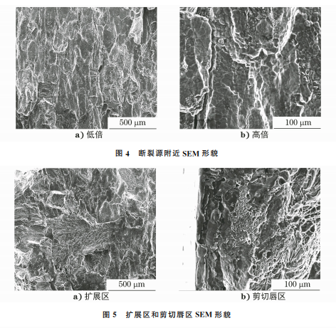 在斷口處取樣,去除表面污漬,并用毛刷輕刷斷 口,放入掃描電鏡(SEM)進(jìn)行觀察。斷裂源附近的 SEM 形貌如圖4所示,該區(qū)域較平坦,放大后有明 顯的沿晶特征,且個別區(qū)存在大晶粒中包裹小晶粒 的形態(tài)。擴(kuò) 展 區(qū) 和 剪 切 唇 區(qū) SEM 形 貌 如 圖 5 所 示,擴(kuò)展區(qū)主要呈解理+沿晶斷裂特征,剪切唇區(qū)主 要呈剪切韌窩特征。