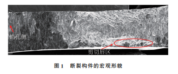 斷裂構(gòu)件的宏觀形貌如圖1所示,觀察發(fā)現(xiàn)斷 裂起源于銷孔的中心線位置,整個斷面未見明顯的 擴(kuò)展棱線特征,但是斷面有兩個不同的特征區(qū)域:靠 近銷孔位置的斷面呈現(xiàn)灰色,較粗糙,呈現(xiàn)“冰糖狀” 特征;遠(yuǎn)離銷孔位置的斷面表面顏色光亮,呈金屬光 澤,有纖維狀特征??梢猿醪酵茢?斷裂從銷孔側(cè)開 始,逐漸向材料內(nèi)部擴(kuò)展。另外,在壁厚的邊緣位置 發(fā)現(xiàn)有部分剪切唇區(qū)。