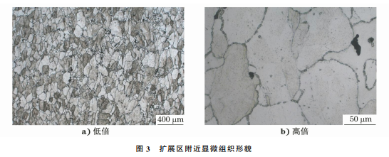 擴(kuò)展區(qū)附近組織為 α(Al)+ 彌散相 + 化合物 相,晶界有析出,依據(jù)標(biāo)準(zhǔn) GB/T6394—2002 對擴(kuò) 展區(qū)附近的晶粒度級別進(jìn)行評定,結(jié)果為4.5級,整 個試樣未發(fā)現(xiàn)明顯的冶金缺陷,擴(kuò)展區(qū)附近的顯微 組織形貌如圖3所示。
