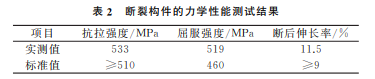 根據(jù) GB/T 228.1—2010 《金 屬 材 料 拉 伸 試 驗 第1部分:室溫試驗方法》,對斷裂構(gòu)件進(jìn)行拉伸 性能測試,結(jié)果如表2所示,試樣的抗拉強(qiáng)度、屈服 強(qiáng)度和斷后伸長率均滿足標(biāo)準(zhǔn)要求。