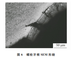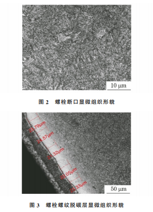 (1)螺紋牙根表面脫碳嚴(yán)重,導(dǎo)致螺栓表面硬 度和抗拉強(qiáng)度降低,并在螺紋根部引起較大的應(yīng)力 集中,在循環(huán)沖擊載荷作用下,應(yīng)力集中位置的螺紋 牙根部脫碳層的晶界弱化區(qū)萌生微裂紋,內(nèi)部夾雜 物含量過 高 促 進(jìn) 了 裂 紋 擴(kuò) 展,最 終 導(dǎo) 致 螺 栓 疲 勞 斷裂。