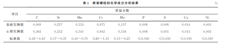 對斷裂螺栓表面和心部進(jìn)行化學(xué)成分分析,結(jié) 果如表1所示。由表1可知:螺栓表面碳含量僅為 0.009%,遠(yuǎn)低于 GB/T3077—2015 《合金結(jié)構(gòu)鋼》 的要求;螺 栓 心 部 的 其 他 元 素 含 量 均 符 合 該 標(biāo) 準(zhǔn) 要求。