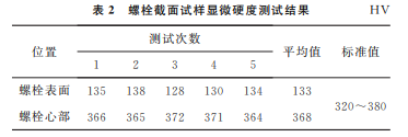 利用402MVD型硬度計(jì)在螺栓截面外表面及 其心部位置進(jìn)行顯微硬度測試,各測試5點(diǎn)硬度再 取平均值,結(jié)果如表2所示。由表2可知:螺栓表面 顯微硬度平均值為133 HV,螺栓心部顯微硬度平 均值為368HV,螺栓表面硬度明顯低于心部硬度。 根據(jù) GB/T3098.1—2010要求,10.9級(jí)螺栓顯微硬 度為320~380HV,斷裂螺栓表面顯微硬度不符合 標(biāo)準(zhǔn)要求。