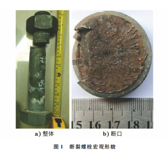 在某臺(tái)2 MW 機(jī) 組 定 期 檢 修 中,發(fā) 現(xiàn) 其 塔 筒 基礎(chǔ)環(huán) 外 側(cè) 螺 栓 斷 裂,斷 裂 螺 栓 材 料 為 35CrMo 鋼,尺寸(直徑×長度)為 42 mm×230 mm,性 能 等級(jí)為10.9級(jí)。該機(jī)組于2013年6月投產(chǎn)運(yùn)行, 目前已累計(jì)運(yùn)行8a。為了研究螺栓斷裂的原因, 筆者對該斷 裂 螺 栓 進(jìn) 行 了 一 系 列 理 化 檢 驗(yàn),并 提 出預(yù)防措施。