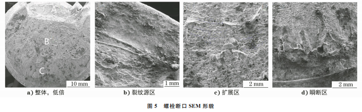 為了改善螺栓顯微組織,得到理想的回火索氏 體組織,在機(jī)械加工完成后要對螺栓進(jìn)行調(diào)質(zhì)處理, 以提高螺栓的強(qiáng)度和抗疲勞性能[8-9]。斷裂螺栓顯 微組織中含有過多線性分布的條狀?yuàn)A雜物和無規(guī)則 分布的球狀?yuàn)A雜物。有研究[10-11]表明:夾雜物與基 體的彈塑性存在較大差異,夾雜物的存在破壞了金 屬基體的均勻性和連續(xù)性;另外,夾雜物周圍易形成 應(yīng)力集中,從而引起夾雜物本身開裂或使基體與夾 雜物界面處開裂[12],使夾雜物發(fā)生破碎、脫落而形 成微小孔洞,螺栓承載面積減小,其服役性能降低。 斷口上的擴(kuò)展區(qū)占據(jù)大部分面積,擴(kuò)展區(qū)可見明顯 大量的微小孔洞以及裂紋擴(kuò)展臺(tái)階,直至瞬斷區(qū)。 經(jīng)過分析可知,螺栓的斷裂是服役8a以來內(nèi)部損 傷不斷積累引起的,而非瞬時(shí)過載斷裂。