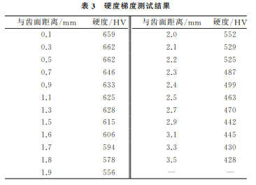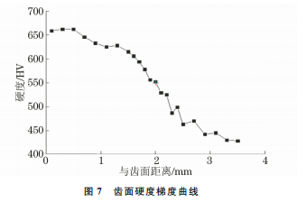 度,結(jié)果如表3所示,齒面硬度梯度曲線如圖7所