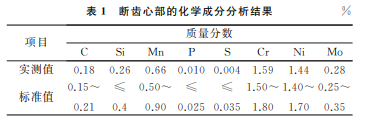 從斷齒上取樣,按照 GB/T4336—2016《碳素鋼 和中低合金鋼 多元素含量的測定 火花放電原子發(fā) 射光譜法(常規(guī)法)》,用直讀光譜儀分析斷齒心部的 化學成分,結(jié)果如表1所示,結(jié)果符合 EN10084— 2008《滲碳鋼交貨技術(shù)條件》對18CrNiMo7-6鋼的 要求。