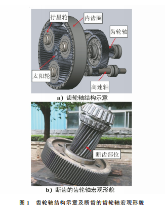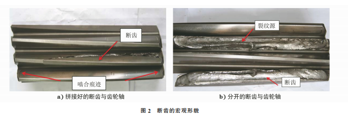 齒輪軸是風電齒輪箱的核心部件,一端用來嚙 合齒輪,另一端用來過盈裝配大齒輪,其承受的彎曲 應(yīng)力較大,在使用過程中容易發(fā)生斷齒。齒輪軸的 材料為 18CrNiMo7-6 鋼,其 一 般 的 生 產(chǎn) 工 藝 流 程 為:煉鋼→鍛造→鍛后正回火→粗加工→滲碳淬火 →精加工。某風電齒輪箱在運轉(zhuǎn)了約10個月后,其 齒輪軸發(fā)生斷齒,齒輪軸結(jié)構(gòu)示意及斷齒的齒輪軸 宏觀形貌如圖1所示。筆者采用一系列理化檢驗方 法對該齒輪軸的斷齒原因進行分析。