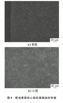 由化學成分、硬度測試和金相檢驗結(jié)果可知:齒 輪軸斷齒的化學成分、晶粒度、齒面硬度、滲碳層深 度、硬度梯度等結(jié)果均符合設(shè)計及標準要求。