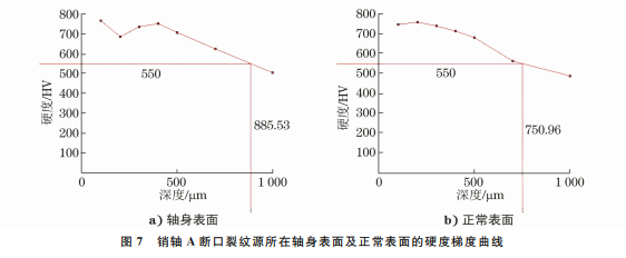 圖7為銷軸 A 斷口裂紋源所在軸身表面及正 常表面的硬度梯度曲線,軸身表面的有效硬化層深 度為0.885mm,但其表面硬度曲線呈“V”形起伏分 布,這與批次號碼處經(jīng)二次淬火+二次回火處理有關(guān);正常表面有效硬化層深度為0.751mm,硬度梯 度曲線自然平滑,無異常起伏。