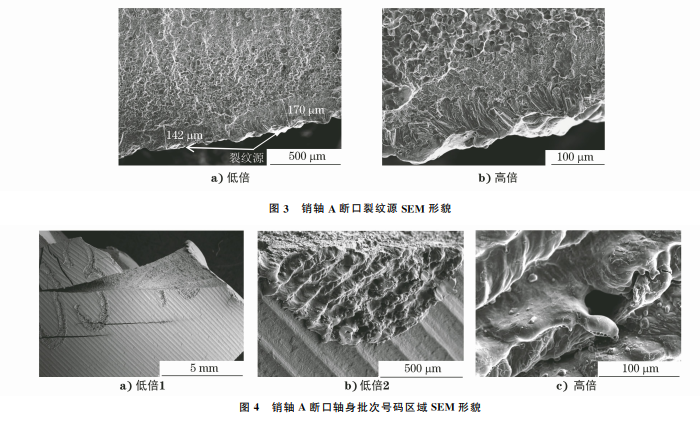 該銷軸斷裂模式為應(yīng)力集中條件下的高應(yīng)力疲 勞斷裂,其疲勞開裂起始于銷軸表面激光打標批次 號碼導(dǎo)致的結(jié)晶裂紋。該銷軸在經(jīng)滲碳淬火處理 后,軸身表面采用熱激光打標來標識批次號碼,這極 易在工件表面形成二次淬火+回火的燒傷組織,甚 至形成結(jié)晶裂紋,增加了標識位置的應(yīng)力集中系數(shù), 改變了燒傷位置的應(yīng)力分布狀態(tài),增加了其開裂風(fēng) 險,從而使工件的疲勞強度和壽命降低。