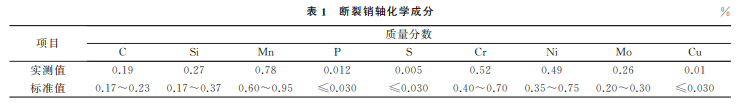 在斷裂銷軸基體取樣進行化學(xué)成分分析,結(jié)果 如 表1所 示 ,可 見 斷 裂 銷 軸 各 元 素 含 量 均 符 合GB/T3077—2015《合金結(jié)構(gòu)鋼》對20CrNiMo鋼 化學(xué)成分的要求。