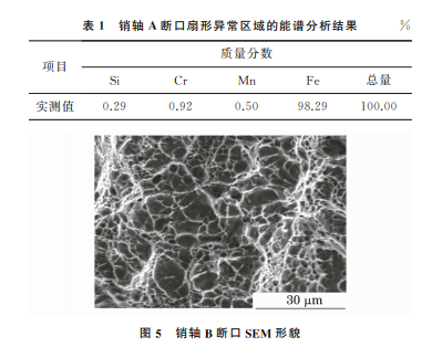 將斷裂銷軸的斷口經(jīng)乙醇超聲清洗后,用掃描 電鏡(SEM)進行觀察,A 斷口裂紋源的 SEM 形貌 如圖3所示。由圖3可知:A 斷口的裂紋源位于軸 身外表面處,裂紋源區(qū)存在多處呈扇形的異常區(qū)域, 扇形異常區(qū)域邊緣最深約為0.17mm,呈樹枝狀圓 滑結(jié)晶形貌,與樹枝狀圓滑結(jié)晶形貌相鄰斷口為較 窄的沿晶形貌,斷口其他區(qū)域為準解理+疲勞輝紋 形貌。圖4為 A 斷口軸身批次號碼區(qū)域的SEM 形 貌,由圖4可知:A 斷口裂紋源區(qū)域軸身表面的機加 工刀痕較明顯,激光打標批次號碼的 SEM 形貌呈 圓滑結(jié)晶狀,符合金屬高溫熔融后的自由結(jié)晶形貌 特征[1],局部區(qū)域可觀察到裂紋缺陷,批次號碼打標 位置與 A 斷口裂紋源的扇形異常區(qū)域在同一位置。 表2為銷軸 A 斷口扇形異常區(qū)域的能譜分析結(jié)果, 該區(qū)域組成的元素及含量與基體基本一致,未見夾 雜類的特征元素。圖5銷軸 B 斷口的 SEM 形貌, 該區(qū)域的微觀形貌以韌窩為主。