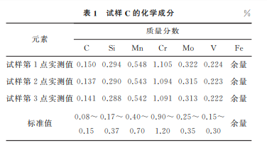 采用 GS1000-Ⅱ型真空直讀光譜儀對(duì)試樣 C進(jìn) 行化學(xué)成分分析,對(duì)軸向切面隨機(jī)選擇3個(gè)位置進(jìn) 行分析,結(jié)果如表1所示。由表1可以看出,試樣 C 的化學(xué)成分符合標(biāo)準(zhǔn) GB/T5310—2017《高壓鍋爐 用無(wú)縫鋼管》關(guān)于12Cr1MoVG 鋼的相關(guān)要求。