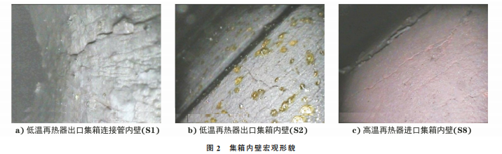 進(jìn)一步檢查存在疑似裂紋的部位,發(fā)現(xiàn)存在呈 海灘形貌密集分布的龜裂狀裂紋,個(gè)別裂紋裂口明 顯且貫穿整個(gè)視場(chǎng),集箱內(nèi)壁宏觀形貌如圖2所示。 對(duì)管座角焊縫進(jìn)行磁粉檢測(cè),在編號(hào)分別為S1,S4, S8的疏水管管座及母管外表面均存在不同數(shù)量的 裂紋,部分疏水管座周圍有明顯的帶壓堵漏痕跡。