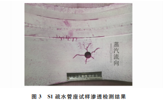 選取具有代表性的低溫再熱器出口集箱的 S1 疏水管座位置前后各200mm 范圍集箱進(jìn)行切割取 樣。對(duì)切取的試樣疏水孔周邊母管內(nèi)壁進(jìn)行滲透檢 測(cè),檢測(cè)結(jié)果如圖3所示,發(fā)現(xiàn)疏水孔周圍母材有 5條以管口為中心的放射狀裂紋,有幾條已經(jīng)貫穿 內(nèi)壁和外壁。從管口開始,沿蒸汽流向200 mm× 150mm 范圍的管壁內(nèi)表面發(fā)現(xiàn)大量細(xì)密裂紋(見 圖4),均呈典型的海灘狀裂紋條帶。其中,母管內(nèi) 壁焊縫兩側(cè)加工過渡坡口的倒角處有兩條明顯的橫 向裂紋,且已經(jīng)貫穿內(nèi)壁和外壁。