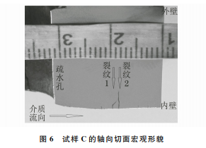 取S1疏水管附近部分母材為試樣(見圖5編號(hào)C試樣),對(duì)其進(jìn)行打磨和拋光,選擇軸向切面作為 分析對(duì)象??梢园l(fā)現(xiàn),靠近疏水孔位置管壁內(nèi)表面分布著長(zhǎng)短不一的裂紋,長(zhǎng)度普遍小于1mm,部分 裂紋長(zhǎng)度超過5 mm,最長(zhǎng)的兩條裂紋分別編號(hào)為 1,2,試樣 C的軸向切面宏觀形貌如圖6所示。