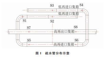 位于爐頂?shù)牡蜏卦贌崞鞒隹诩?、高溫再熱?進(jìn)口及出口集箱共有8個(gè)疏水管,具體分布位置如 圖1所示,發(fā)現(xiàn)母管內(nèi)表面存在疑似裂紋的疏水孔 編號(hào)為S1,S2,S6,S8。再熱器進(jìn)口及出口集箱的疏 水管均單獨(dú)連接到地面的集中疏水點(diǎn),疏水閥集中 布置在該處,疏水系統(tǒng)采用的疏水方式為定期疏水, 即在疏水閥疏水前,疏水管內(nèi)一直有冷凝水。在鍋 爐運(yùn)行狀態(tài)下的實(shí)測(cè)數(shù)據(jù)表明,低溫再熱器出口集 箱溫度約為490 ℃時(shí),疏水管距離母管1m 處的溫 度約為200 ℃,表明疏水管內(nèi)的蒸汽溫度比母管內(nèi) 的蒸汽溫度低,而且在短距離內(nèi)變化明顯。