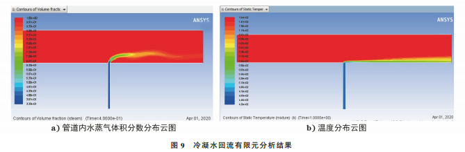 進(jìn)口 采 用 壓 力 進(jìn) 口 邊 界 條 件,介 質(zhì) 為 壓 力 3.6MPa、溫度470 ℃的水蒸氣,第一相體積分?jǐn)?shù)為 100%,出口采用壓力出口邊界條件,熱段管道壁面 為絕熱邊界,疏水管壁面對(duì)流換熱系數(shù)由大空間自 然對(duì)流換熱努賽爾數(shù)經(jīng)驗(yàn)關(guān)聯(lián)式計(jì)算獲得;同時(shí)將 疏水管下部區(qū)域初始化為第二相體積分?jǐn)?shù)為100% 的水空間,水位線距管口400 mm。冷凝水回流有 限元分析結(jié)果如圖9所示。