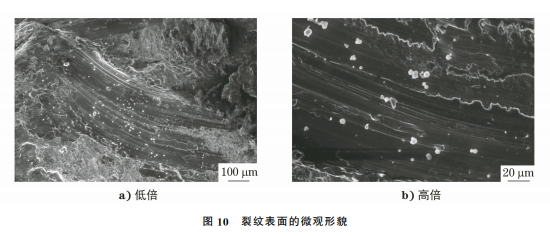 該機(jī)組運(yùn)行時(shí)間已經(jīng)達(dá)到7×10 4 h,作為局域 網(wǎng)的調(diào)峰機(jī)組,該機(jī)組啟停次數(shù)相對(duì)較多,負(fù)荷波動(dòng) 較頻繁,冷凝水周期性回流,在疏水孔及集箱內(nèi)壁表 面形成周期性冷熱交替,部分集箱內(nèi)壁表面形成海 灘狀疲勞條帶,疏水孔內(nèi)壁形成放射狀裂紋。隨著 時(shí)間的推移,內(nèi)表面的裂紋貫穿管壁。如果宏觀斷口上有疲勞弧線和疲勞臺(tái)階(又稱為疲勞勾線),或 者微觀斷口上有疲勞條帶,就可以判定該斷口為疲 勞斷口。圖10為裂紋表面的微觀形貌,由圖10可 以看出:裂紋表面存在疲勞條帶,與分析結(jié)果吻合。 疲勞失效是最危險(xiǎn)的失效形式之一,構(gòu)件在疲勞失 效時(shí)一般沒有宏觀塑性變形,可能造成災(zāi)難性后果。