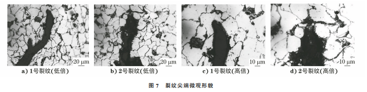 依據(jù) GB/T13298—2015 《金屬顯微組織檢驗(yàn) 方法》對(duì)試樣軸向切面打磨、拋光后進(jìn)行金相檢驗(yàn)。 根據(jù) DL/T773—2016《火電廠用12Cr1MOV 鋼球 化評(píng)級(jí)標(biāo)準(zhǔn)》對(duì)試樣進(jìn)行球化評(píng)級(jí),試樣正常區(qū)域組 織為鐵素體+珠光體,3級(jí)球化,符合使用要求。編 號(hào)為1,2的裂紋起源于母管內(nèi)壁,并垂直于管壁由 內(nèi)向外擴(kuò)展,裂紋開口較大,裂紋擴(kuò)展前沿形狀圓鈍 且貫穿晶粒。主裂紋上伴有大量二次裂紋,均為穿 晶擴(kuò)展,裂紋尖端的微觀形貌如圖7所示。