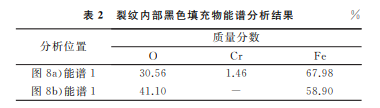 選取靠近2號(hào)裂紋尖端和裂紋根部的兩處位置 進(jìn)行掃描電鏡觀察和能譜分析,結(jié)果如圖8和表2 所示,可以看出在裂紋縫隙中充滿了黑色物質(zhì)。裂 紋中的填充物主要是鐵的氧化物,部分位置含有少 量的鉻元素。結(jié)合裂紋形態(tài)可知裂紋擴(kuò)展速度較 慢,存在長(zhǎng)期氧化情況,從而表現(xiàn)出熱疲勞特征[4-5]。