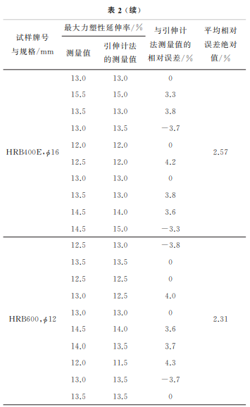 利 用 上 述 方 法,采 用 電 子 拉 力 試 驗(yàn) 機(jī) (INSTRON5500R)和萬(wàn)能材料試驗(yàn)機(jī)(INSTRON 5592)以相同的速率對(duì)不同牌號(hào)螺紋鋼的最大力塑 性延伸率進(jìn)行了測(cè)量,并與引伸計(jì)直接讀數(shù)法的測(cè) 量結(jié)果進(jìn)行比較,結(jié)果如表2所示。
