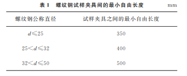 以牌號(hào)分別為 HRB400,HRB400E,HRB600, HRB500E,HRBF400,HRBF500E的國(guó)產(chǎn)熱軋螺紋 鋼為試驗(yàn)對(duì)象,每10個(gè)試樣為一組(具有相同的牌 號(hào)和規(guī)格),試樣來(lái)自不同的生產(chǎn)廠家和爐批號(hào)。測(cè) 量結(jié)果與已有足夠引伸距離引伸計(jì)的直接測(cè)量結(jié)果 進(jìn) 行 比 較。 螺 紋 鋼 試 樣 表 面 狀 態(tài) 符 合 GB/T228.1—2010的有關(guān)要求,試樣夾具間的最小自由 長(zhǎng)度如表1所示。