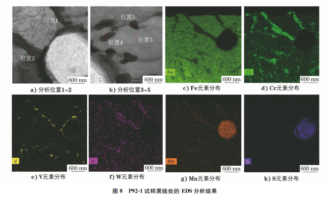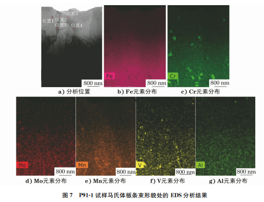 對P91-1試樣馬氏體板條束形貌處進行 EDS 分析,結(jié)果如圖7所示,可見位置1和5處析出物含 有大量 Cr、Mo、Mn、V 等元素,遠高于基體(位置 2~4)處。