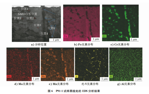 對P91-1試樣黑線處進行EDS分析,結(jié)果如圖 6所示。由圖6可知:黑線富含Cr、Mo、Mn、V等元 素;位置1~4處的Cr、Mo、Mn、V 等元素含量遠高 于基體(位置5~6)處,與晶界析出物(位置3)基本 相同,析出物為 M23C6 [4]。為了分析黑線(析出物) 的結(jié)構(gòu),選取了其中較大的析出物顆粒進行SAED分析,分析位置如圖6a)所示,結(jié)果顯示析出物為面 心立方結(jié)構(gòu)。