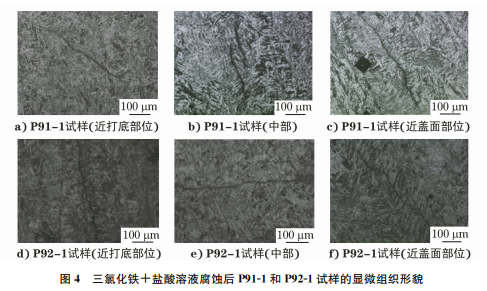 (2)P91鋼和 P92鋼焊接冶金過程中,Cr和 Mo等元素在柱狀晶之間偏聚,并在焊后熱處理時以 M23C6 碳化物的形式在柱狀晶晶界析出,呈線狀 排列,腐蝕后在光學(xué)顯微鏡下呈現(xiàn)黑色。