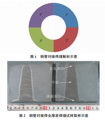 鋼管對接焊后,按圓周方向均分為4個試樣,依 次編號為1# ~4# (見圖1),其中1# 試樣焊態(tài)不進 行熱處理,2# ~4# 試樣均進行760 ℃的焊后熱處 理,然后取全厚度焊縫試樣(見圖2)、金相檢驗試樣 (三氯化鐵+鹽酸溶液擦拭腐蝕或體積分數(shù)為10% 硫酸溶液電解腐蝕)、透射電鏡(TEM)試樣(用聚焦 離子束取樣)。