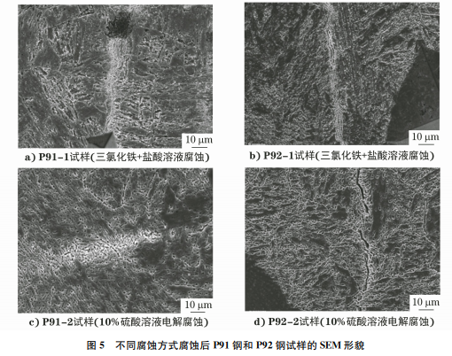 (1)P91鋼和P92鋼的全焊縫范圍內(nèi)均存在黑 線,主要位于柱狀晶之間。黑線并非裂紋,為焊后熱 處理時析出的線狀排列 M23C6 碳化物。