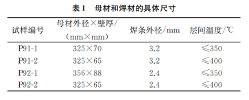 P91鋼管和P92鋼管的坡口均為 U 型坡口,焊 前預(yù)熱溫度為200~250℃,手工鎢極氬弧焊裝點并 打底,焊條采用手工電弧焊過渡,其余部分采用埋弧 自動焊,焊接速率為20cm/min~50cm/min,焊后 熱處理溫度為(760±10)℃,保溫時間為5h。母材 和焊材的具體尺寸如表1所示。
