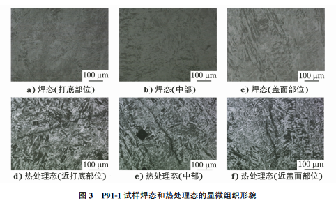 P91-1試樣焊態(tài)未發(fā)現(xiàn)黑線[見圖3a)~3c)]; 760℃焊后熱處理后,P91-1試樣熱處理態(tài)的近打底 部位、中部和近蓋面部位均可見黑線,且不同位置的 黑線形貌特征無明顯差異[見圖3d)~3f)]。