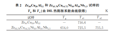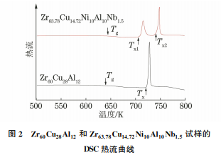 圖2為Zr60Cu28Al12 和Zr63.78Cu14.72Ni10Al10Nb1.5 試樣的DSC熱流曲線,可見(jiàn)明顯的玻璃化轉(zhuǎn)變(吸 熱過(guò)程)和結(jié)晶峰(放熱過(guò)程),也證明了合金的非晶 態(tài)本質(zhì)。兩個(gè)試樣的結(jié)構(gòu)不同,五元合金的結(jié)晶呈現(xiàn)兩步結(jié)晶過(guò)程,對(duì)應(yīng)兩個(gè)結(jié)晶溫度 Tx1 和 Tx2。 可以根據(jù)DSC熱流曲線計(jì)算出相應(yīng)的Tg 和Tx [4], 結(jié)果如表1所示。
