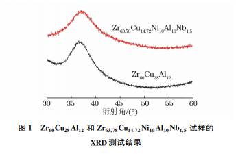 Zr60Cu28Al12 和Zr63.78Cu14.72Ni10Al10Nb1.5 試樣 的XRD測(cè)試結(jié)果如圖1所示。由圖1可見(jiàn),兩個(gè)試 樣均只有一個(gè)寬的漫射峰,沒(méi)有尖銳的布拉格衍射 峰出現(xiàn),表明兩個(gè)試樣都具有非晶態(tài)結(jié)構(gòu)。