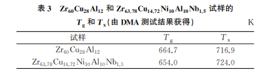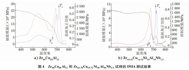 圖4為Zr60Cu28Al12 和Zr63.78Cu14.72Ni10Al10Nb1.5 試 樣的DMA測(cè)試結(jié)果。由圖4可知:損耗角正切值 反映了試樣在振動(dòng)條件下內(nèi)耗(內(nèi)部損耗模量)的大 小;在玻璃態(tài)時(shí),內(nèi)耗隨溫度變化很小,一旦溫度達(dá) 到Tg,合金進(jìn)入黏流態(tài),內(nèi)耗急劇增大;當(dāng)試樣結(jié)晶 后,由于晶體相和未結(jié)晶的黏流體相互摩擦,內(nèi)耗還 會(huì)繼續(xù)急劇增大,所以圖4中玻璃化轉(zhuǎn)變和結(jié)晶過(guò) 程都對(duì)應(yīng)損耗角正切值的峰值[5-6]。以玻璃化轉(zhuǎn)變 的開(kāi)始點(diǎn)作為試樣的Tg,以結(jié)晶轉(zhuǎn)變的峰值作為試 樣的Tx,結(jié)果如表3所示。