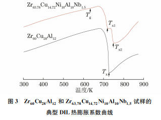 (3)DSC和 DMA 法表征Tg 比 DIL法敏感, 部分金屬玻璃用 DIL法很難界定玻璃化轉(zhuǎn)變過(guò)程 的拐點(diǎn)。
