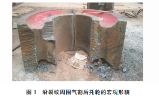某單位生產(chǎn)的托輪,材料為ZG42CrMo鋼,生產(chǎn) 工藝為:澆注→在地坑保溫153h→出坑落砂→切冒 口→熱處理。托輪的正火工藝為,400~450℃保溫 2h,650~700℃保溫3h,900℃保溫32h,空冷+風(fēng) 冷冷卻。托輪的回火工藝為,350~400℃保溫2h, 580℃保溫24h,空冷冷卻。熱處理后將托輪送至機(jī) 械廠,在未調(diào)質(zhì)的情況下對托輪進(jìn)行熱裝,熱裝 2d后發(fā)現(xiàn)托輪減重孔處有沿徑向的穿透性裂紋。對 托輪進(jìn)行現(xiàn)場測定,發(fā)現(xiàn)托輪內(nèi)孔直徑偏小、軸頸過 大,內(nèi)孔與托輪軸的過盈量超過圖紙?jiān)试S值一倍。沿 裂紋周圍氣割后托輪的宏觀形貌如圖1所示。