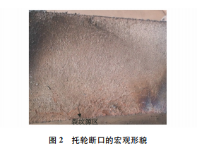 托輪斷口的宏觀形貌如圖2所示,可見裂紋產(chǎn)生于減重孔中部內(nèi)表面,沿徑向軸線方向及兩側(cè)方 向擴(kuò)展;箭頭所示的月牙形區(qū)域?yàn)榱鸭y源區(qū),裂紋源 區(qū)域相對平坦,裂紋沿裂紋源區(qū)向四周擴(kuò)展。