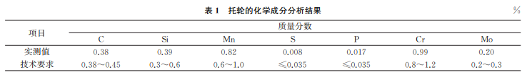 在托輪上取樣進(jìn)行化學(xué)成分分析,結(jié)果如表1 所示,可見托輪的化學(xué)成分均滿足技術(shù)要求。